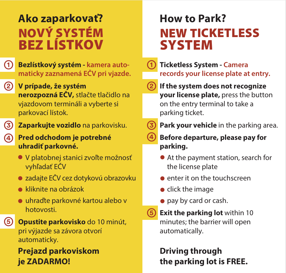 Pri vjazde na parkovisko už nie potrebné stláčať gombík ani čakať na parkovací lístok. Kamera pri vstupe automaticky rozpoznáva evidenčné číslo vášho vozidla. Pred odchodom stačí navštíviť platobnú stanicu, kde zadáte vaše EČV a uhradíte parkovné. Po úhrade sa informácia automaticky prenesie a rampa sa pri výjazde otvorí bez ďalších krokov.